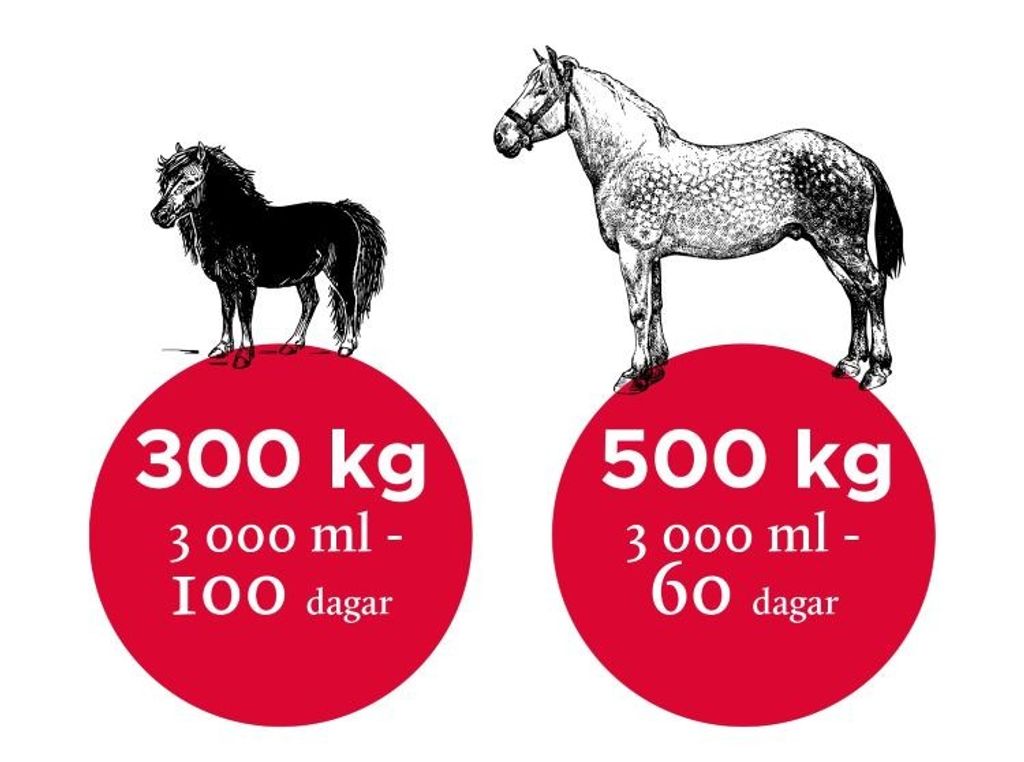 Tillskottet främjar också tarmhälsan och kan bidra till förbättrade avelsresultat. Oljan levereras i en praktisk bag-in-box med två separata påsar (à 1500 ml) och kranar för enkel dosering. Efter att en kran öppnats bör oljan användas inom sex veckor, och förpackningen förvaras helst svalt. Kartongen kan återvinnas som papp och påsarna som restavfall.
