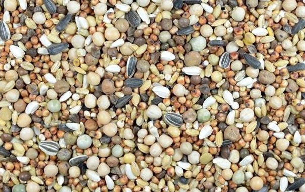 En fullfjädrad duvfoder blandning som innehåller bland annat mjölktistel, linser och sorghum.