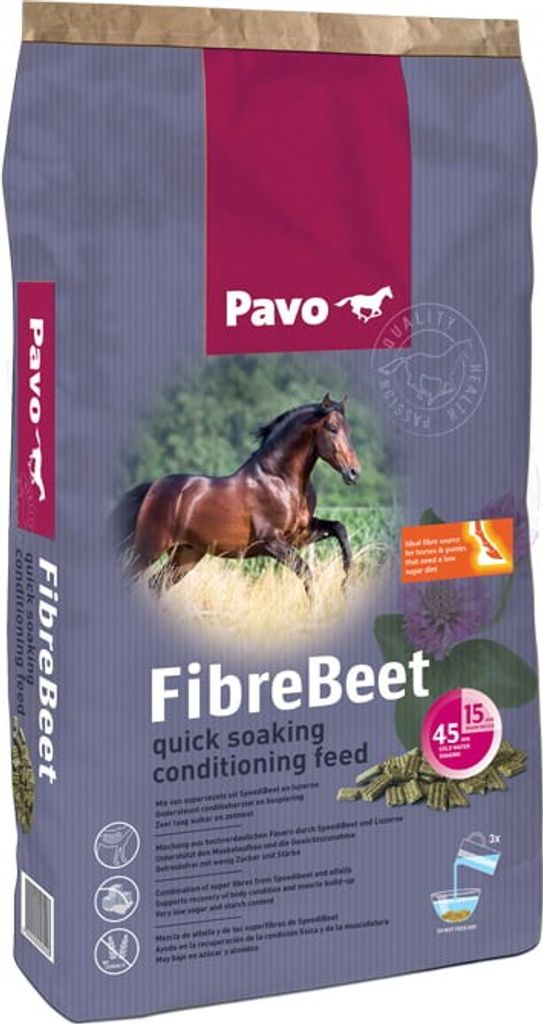Pavo FibreBeet utvecklades speciellt för hästar och ponnys i dålig kondition. Den består av en varsamt sammansatt kombination av SpeediBeet (betfibrer), alfalfa och mycket lättsmälta fibrer från sojaskal med en nypa fenugreek (bockhornsklöver) för smaklighetens skull. Tack vare det högkvalitativa proteininnehållet från alfalfa är FibreBeet det perfekta tillskottet av grovfoder för att få en tunn och trött häst att återfå en perfekt kropp i toppkondition. Pavo FiberBeet är fri från spannmål och har ett lågt innehåll av socker och stärkelse. Den är helt enkelt en väl anpassad produkt för hästar som är känsliga för socker.