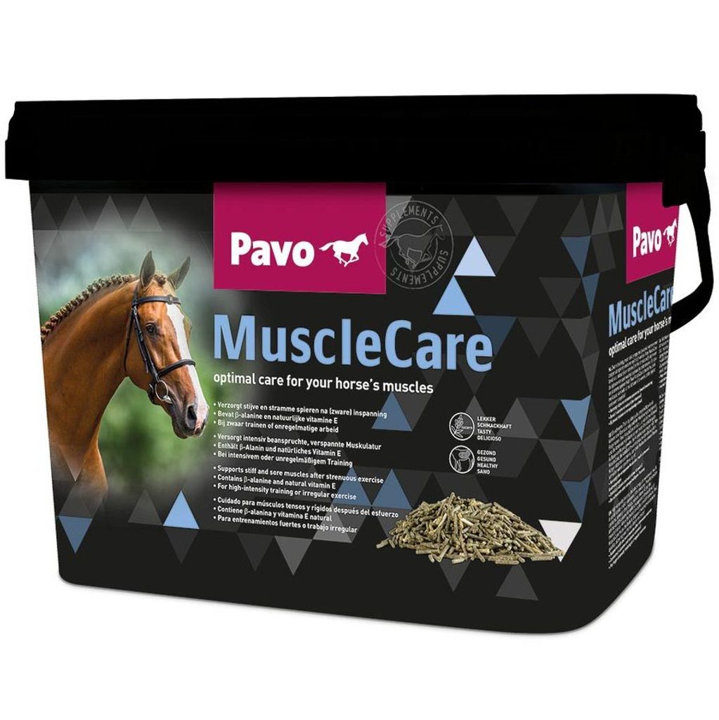 Pavo MuscleCare innehåller de naturliga CellProtect antioxidanterna och dopingfria beta-alanin. Det är en icke-essentiell aminosyra som utgör en del av karnosinet. Beta-alanin stärker muskelns skydd mot mjölksyra. Genom att tillsatta beta-alanin i hästens foder kan hästens kropp producera mer karnosin som fördröjer syrasättningen i musklerna. Som resultat, kan din häst utföra ett högintensivt arbetspass lättare och under längre tid. Pavo MuscleCare innehåller inte vete och passar därför i en glutenfri diet.