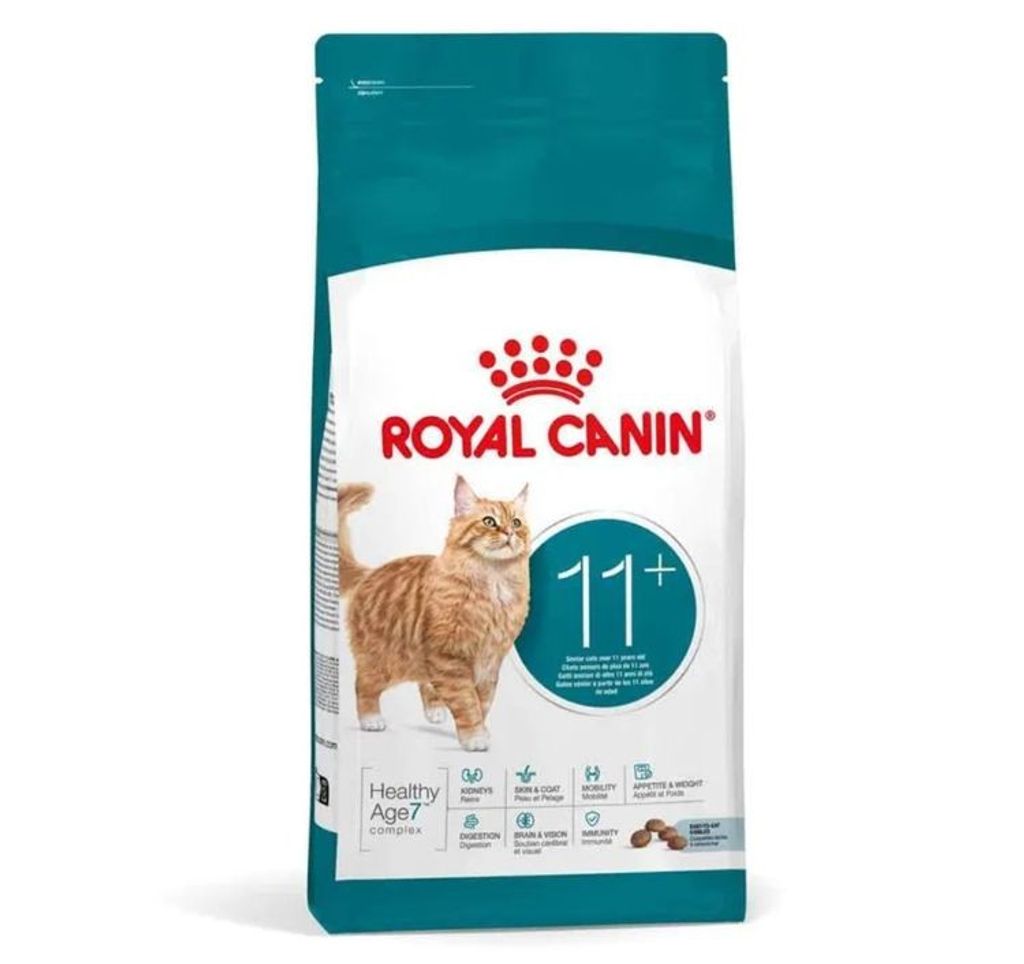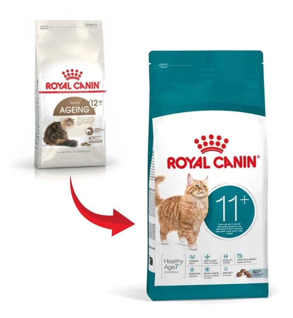 Royal Canin Ageing +11 är en kattmat som är speciellt utvecklad för att din katt ska kunna hålla sig hälsosam när den åldras. Royal Canin Ageing +11 bidrar till bevarad vitalitet och rörlighet genom sitt patenterade antioxidantkomplex samt tillsats av bland annat glukosamin. Kattmatens foderbit stimulerar den äldre kattens aptit tack vare sin knapriga utsida och en mjuk lättuggad kärna. Royal Canin Ageing +11 kattmat hjälper din katt att bibehålla sin vackra päls genom sin optimala balans mellan omega 3 och omega 6, och kattmaten skyddar dessutom den äldre kattens njurar genom ett balanserat innehåll av fosfor.
