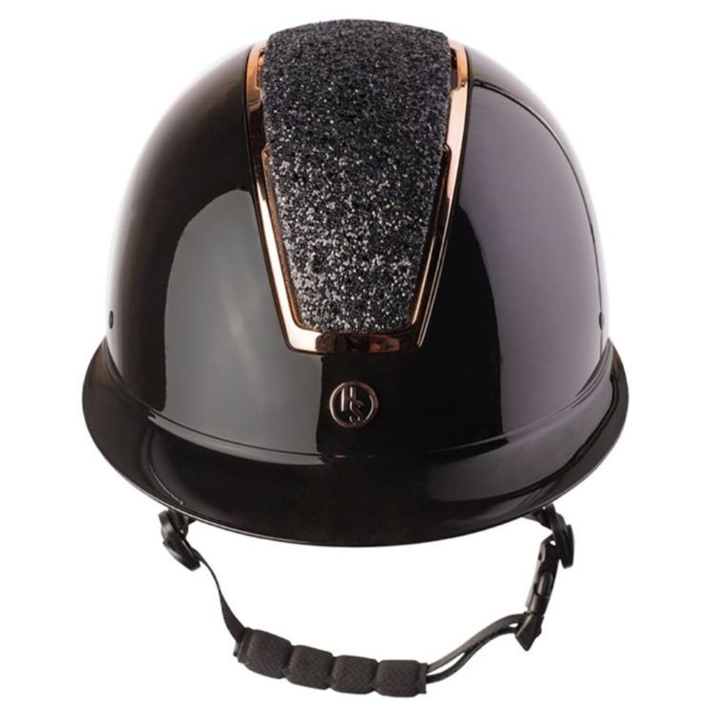 Snygg och stilren ridhjälm med implementerat Mips-system. Med sin breda skärm och glansiga finish har den en modern design, och den glittriga panelen med kant i guld ger en fulländad och snygg look. De 6 ventilationsöppningarna gör att den är bekväm att använda även under längre stunder och vara dagar.