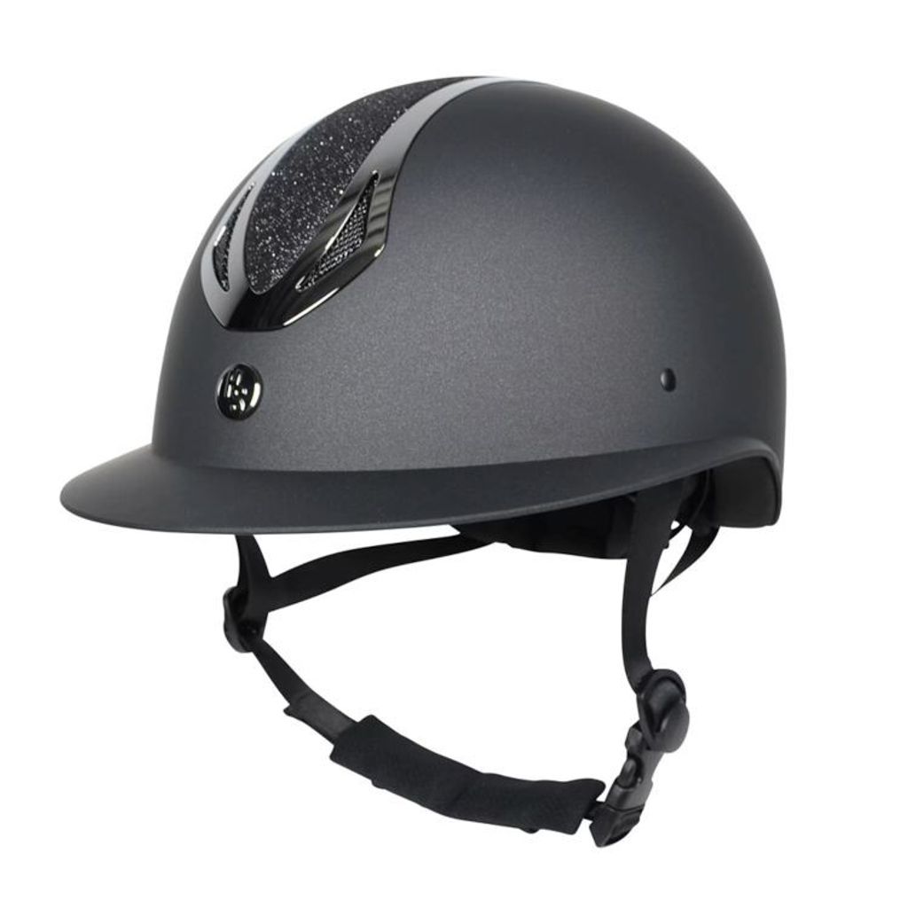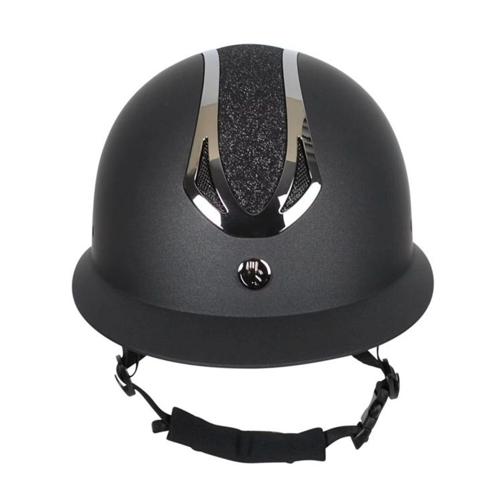 Snygg och stilren ridhjälm som passar lika bra till tävling som daglig användning. Med sin breda skärm och glansiga finish har den en modern design, och den glittriga panelen med kant i silver ger en fulländad och snygg look. Ventilationsöppningarna gör att den är bekväm att använda även under längre stunder och vara dagar.