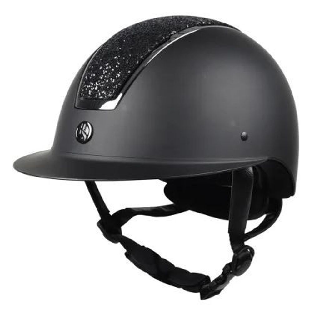Snygg ridhjälm med festligt glitter och praktisk solskärm.