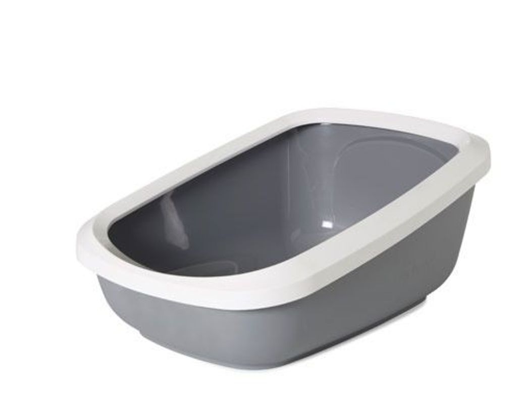 En stor kattlåda med hög bakkant och ram, rekommenderas för stora katter eller hushåll med flera katter.