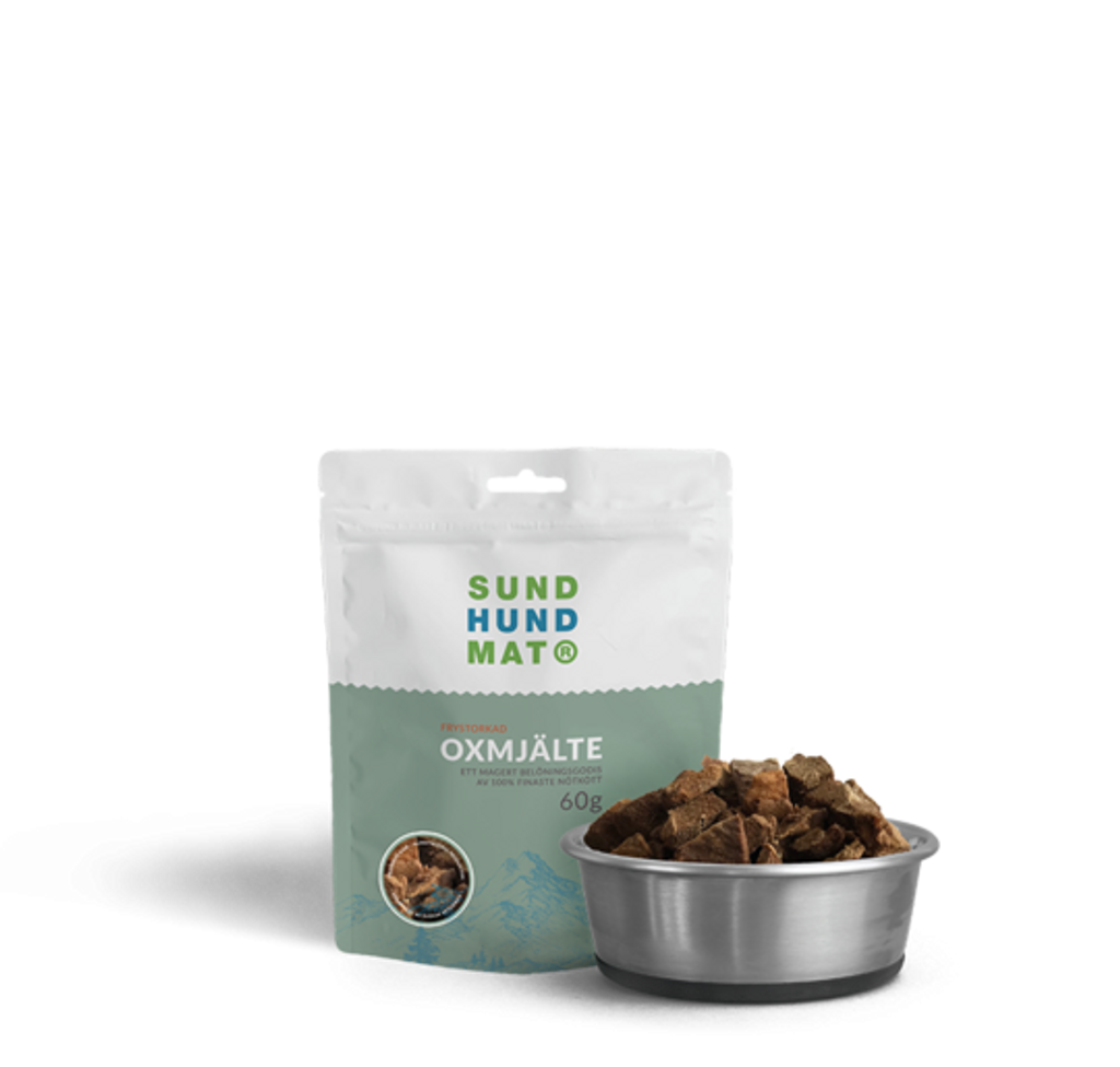 Ett magert och näringsrikt belöningsgodis, helt fritt från tillsatser, som din hund eller katt kommer att älska! Våra frystorkade bitar av Oxmjälte kan ges precis som de är, som belöningsgodis på träning, tävling eller den dagliga promenaden. Till skillnad från tillverkning av vanligt torrfoder, sker frystorkning utan värme. Därmed bibehålls alla naturliga näringsämnen i sin naturliga form utan att förstöras eller försämras, och ingenting behöver tillsättas i efterhand. Godiset går även bra att ge till katter. Perfekt att ha med sig på tävling, träning, i bilen, båten eller stugan, eller när man är på resande fot.