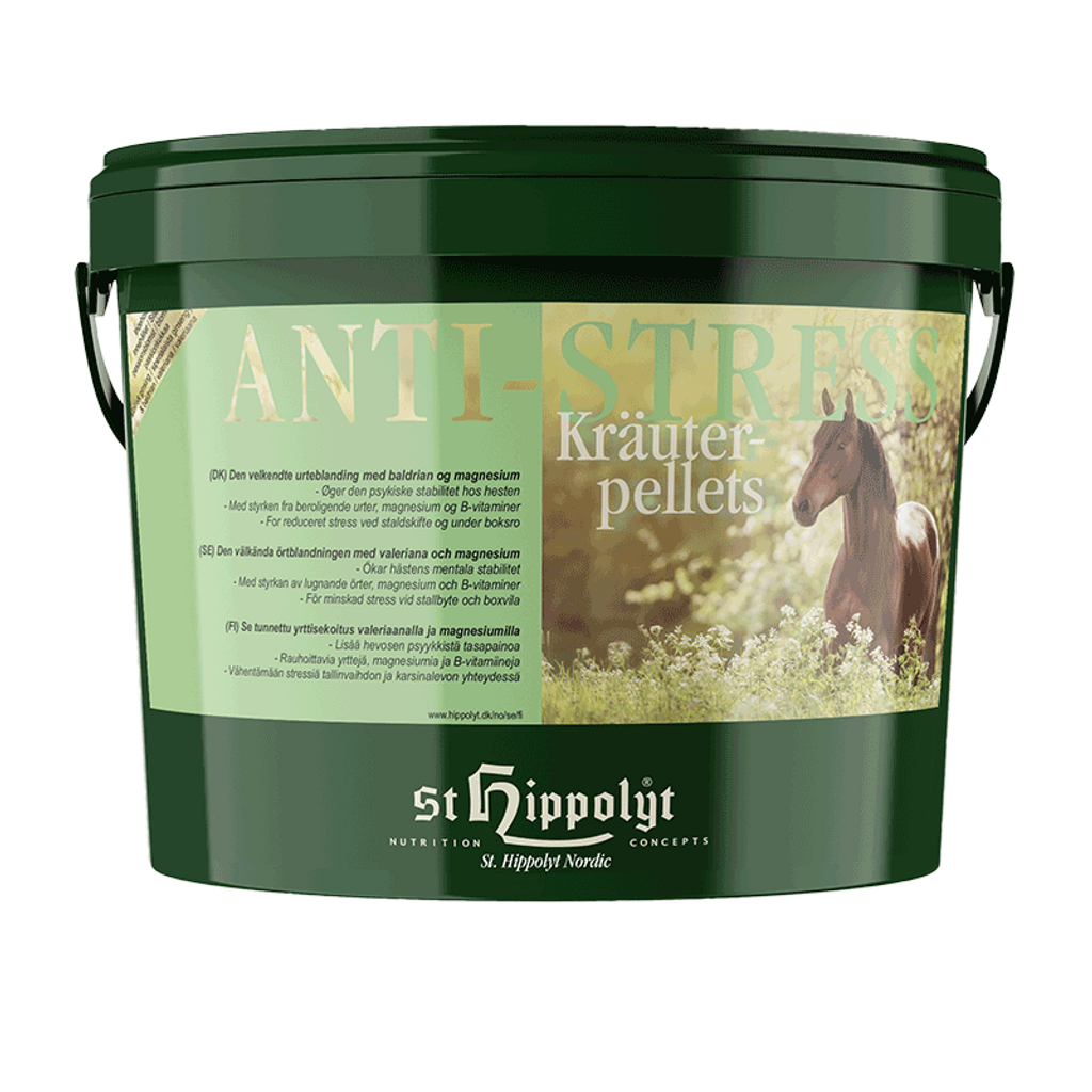 Dietiskt tillskottsfoder till häst. Anti-Stress örtpellets kan användas för att minska nervositet, oro och stress. Utöver Baldrian (Valeriana) är passionsblomster, sibirisk ginseng, humle, dill och lavendel mest kända. Rekommenderad utfodringslängd 2-4 veckor för optimal effekt.