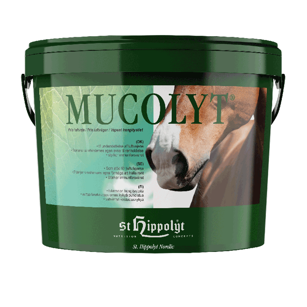 Mucolyt är ett effektivt foderkomplement som innehåller ett brett utval av örter, bland annat pepparmynta, timjan, kamomill, lanceolat, anis, fänkål, kummin och tussilago. För hästar som är uppstallade eller arbetar i dammiga miljöer där det kan finnas behov av att stödja luftvägarnas funktion.