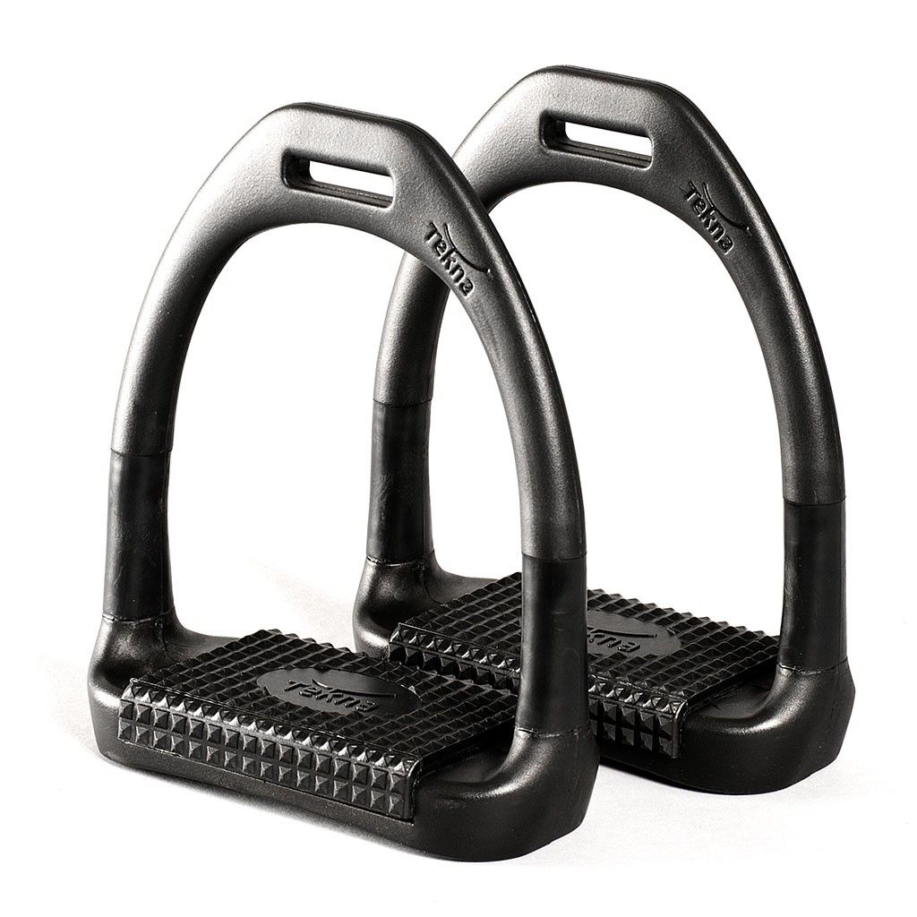 Högteknologisk, lätt stigbygel från Tekna ”Flex-Tek”. Ledbara på båda sidorna och med 7cm bred stigbygelplatta. Levereras med stigbygelplattor av både rostfritt stål och gummi.