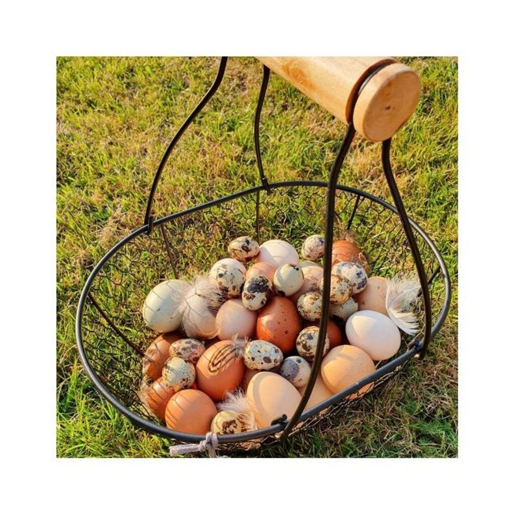 Stor äggkorg som passar alla typer av fågelägg, även vaktelägg. Den snygga designen är kombinerad med ett bekvämt och robust handtag i vackert trä.