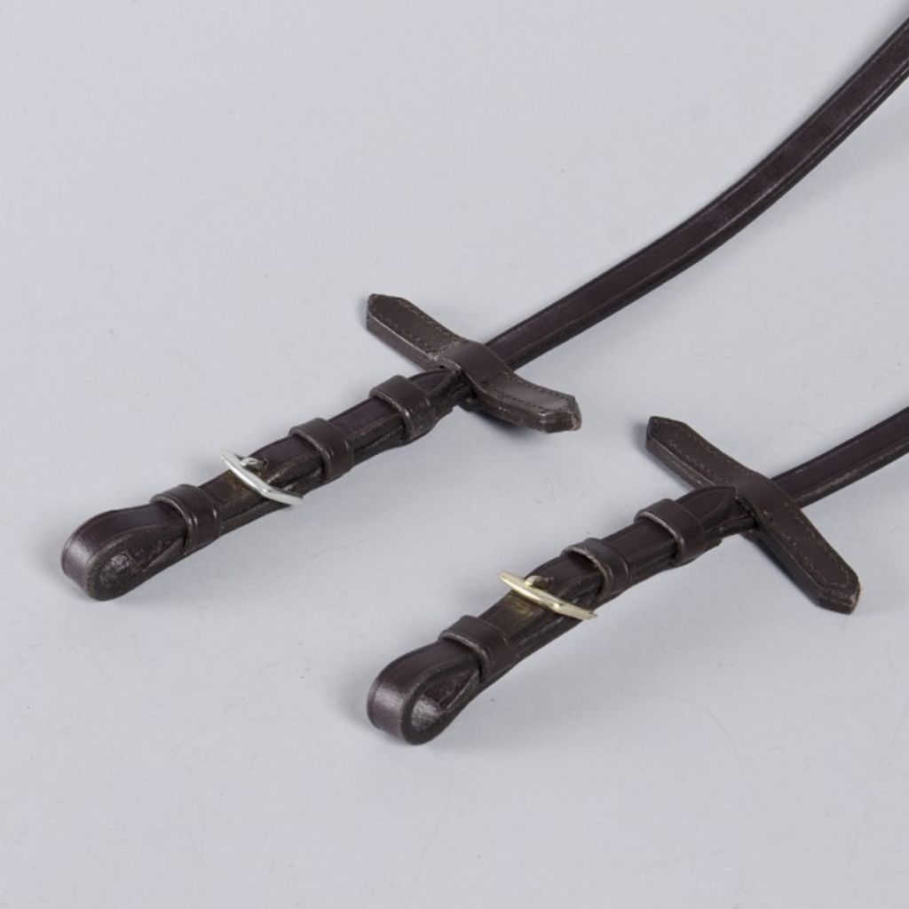 12 mm breda tyglar tillverkade av buffelläder täckta med mönstrat gummi på insidan för bättre grepp. Har även martingalflugor. Beslag i rostfritt stål alternativt mässing.
