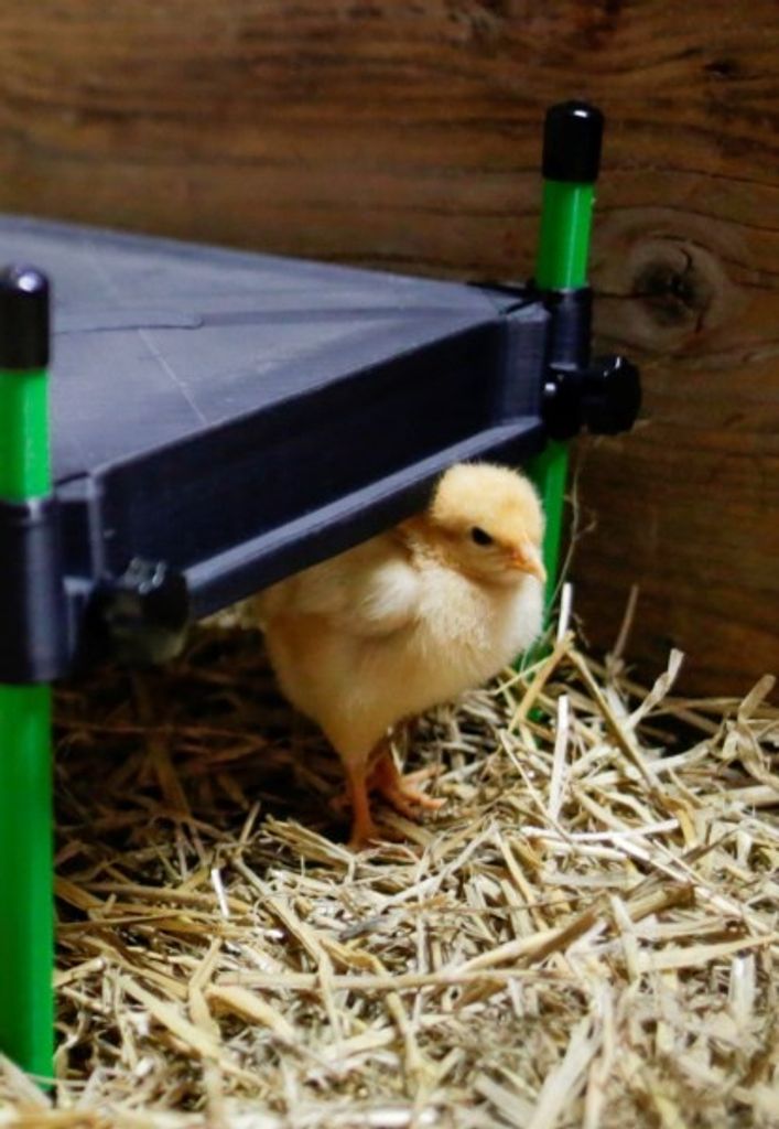 Med sina höj- och sänkbara ben är värmeskivan enkel att anpassa till kycklingarnas storlek.