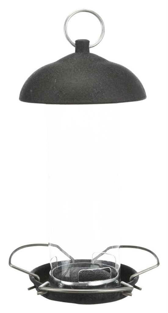 Upphängningsbar foderautomat för vildfåglar. Enkel att fylla på tack vare ett avtagbart tak.