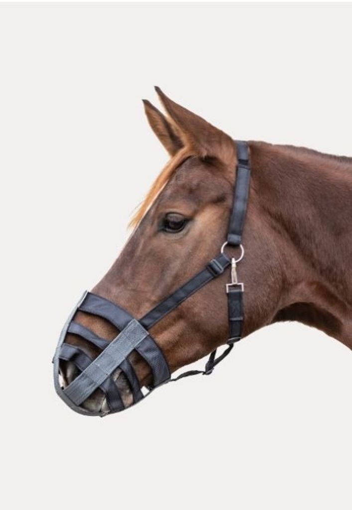 En tålig nosgrimma i nylon från Waldhausen utan gummiinsatser. Fodrad i nospartiet och mjukt vadderad. Sömlöst justerbar huvuddel med kardborrband för extra säkerhet. Används för att förhindra överdriven gräskonsumtion eller vid sjukdom.