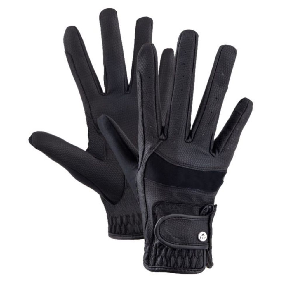 Sportig och funktionell ridhandske som kombinerar stil med prestanda för optimal komfort och grepp. Handsken har en elastisk insats på handryggen för bättre rörelsefrihet, samt en elegant design med läderlook. Med ett praktiskt magnetiskt spänne är den enkel att ta av och på, samtidigt som ventilationsperforeringar ger god andningsförmåga. Handflatan är extra greppvänlig för säkrare hantering av tyglarna. Handsken är dessutom kompatibel med pekskärmar, vilket gör det enkelt att använda mobiltelefonen eller andra enheter utan att ta av sig handskarna i kylan.