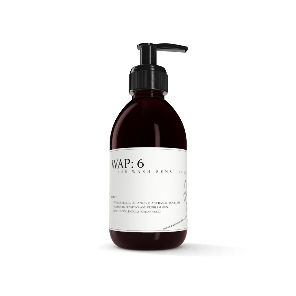 WAP: 6 Fur Wash Sensitive innehåller en unik blandning av naturliga ingredienser, inklusive sjögräs, havreolja, ringblomma, kamomill och nyponfröolja, som lugnar och återfuktar huden samtidigt som de rengör pälsen på ett skonsamt sätt. Schampot är också fritt från parabener och sulfater, vilket gör det till ett säkert val för djur med allergier eller andra känsligheter.