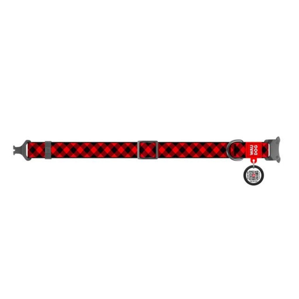 Hundhalsband med Smart ID bricka. Snyggt rött rutmönster som design.