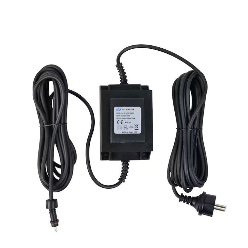 Vattentät transformator, IP68, och sladd (total längd 10 m varav 5 m kontakt-transformator) ingår.