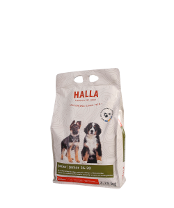 Halla Junior är ett vetefritt helfoder som passar både till valpar och unghundar, samt dräktiga/digivande tikar.
