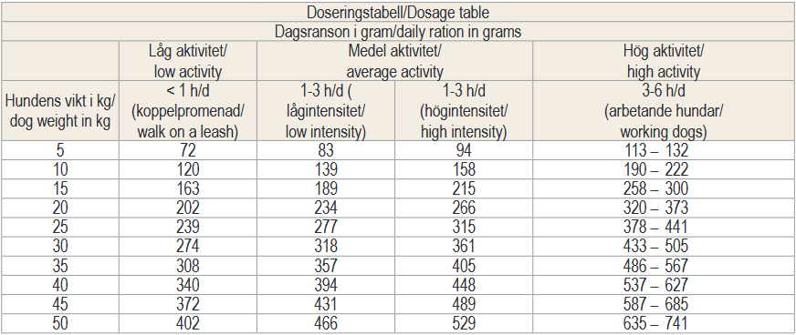 Rekommenderat dagligt intag påverkas av hundens vikt och aktivitetsnivå. Doseringstabellen anger riktvärden för lämplig fodergiva men det är viktigt att justera givan efter din hunds hull, vikt och aktivitet.