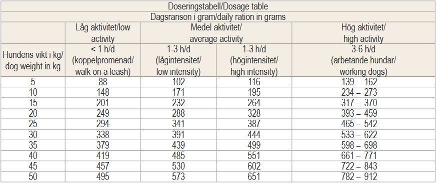 Rekommenderat dagligt intag påverkas av hundens vikt och aktivitetsnivå. Doseringstabellen