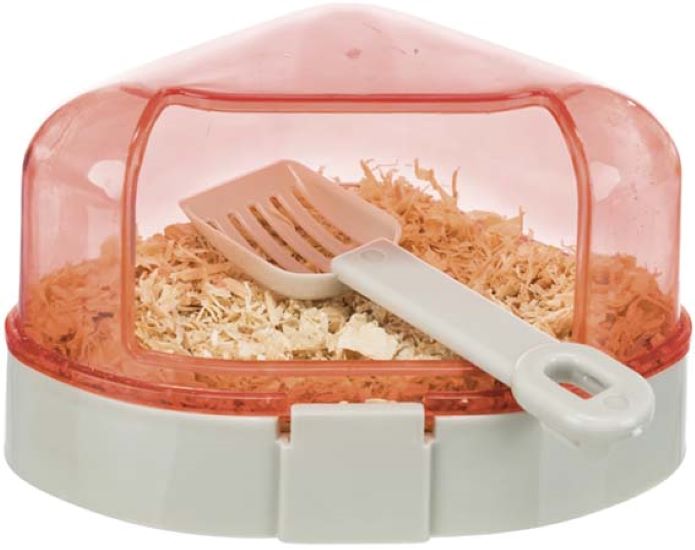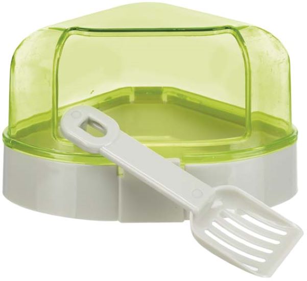 Lyxig hörntoalett som passar i alla smågnagares burar. Kommer med ett tak som minskar att din gnagarkompis sprätter iväg strö eller annat runtom i buren. Dessutom inkluderas även en matchande spade som gör rengöringen av toaletten enkel och smidig.