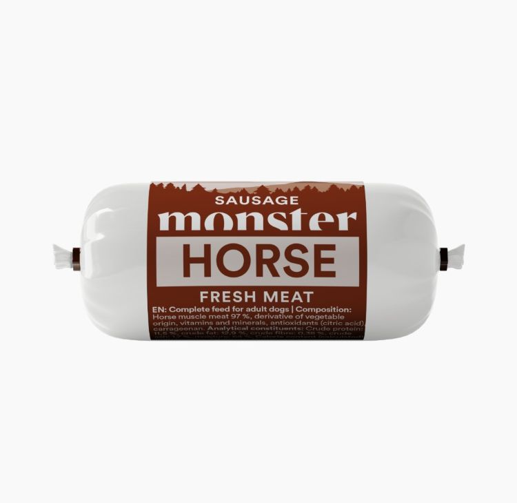 Även den mest kräsna hunden har svårt att motstå denna smakrika, spannmålsfria korv från Monster. Monster Sausage Horse är en köttrik korv där hästkött är både första ingrediens och den enda proteinkällan. Tack vare sin höga smaklighet fungerar den lika bra som ett komplett helfoder som ett extra lyxigt godis vid sidan av. Den mjuka och smidiga konsistensen gör korven enkel att skära i bitar och ta med sig i fickan, eller varför inte riva över hundens vanliga foder för en välsmakande topping.
