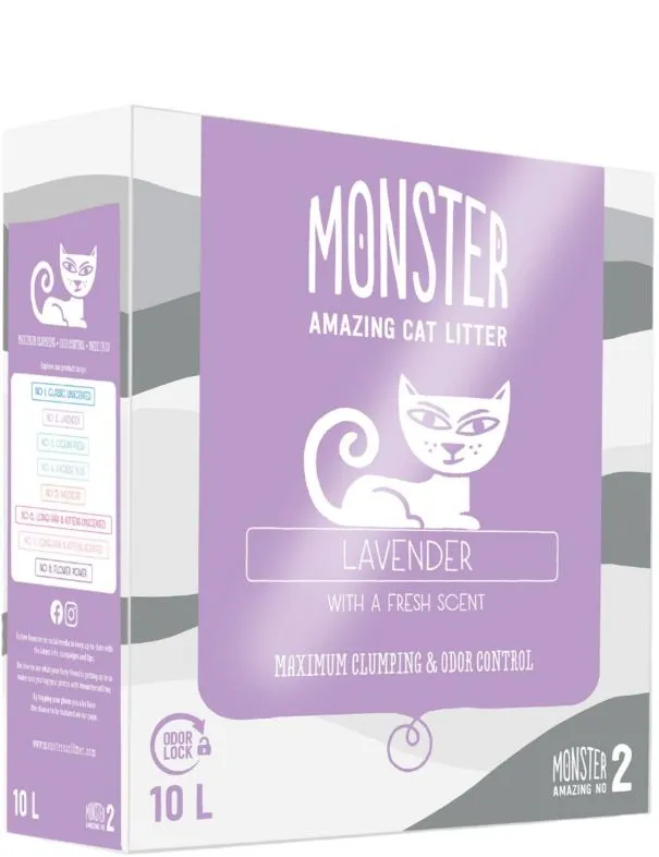 Monster kattsand Lavender är en klumpbildande kattsand som doftar lavendel. Den innehåller aktivt kol, för optimal odörkontroll. Dessutom dammar den väldigt lite vilket är bra både för ägare och katter!