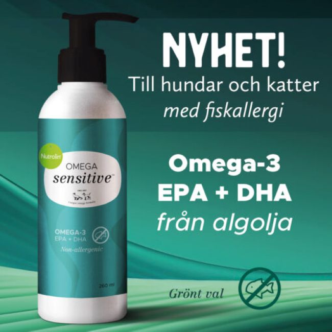 Nutrolin Omega Sensitive är en näringsolja baserad på mikroalger och är en "no-fish" omega-3-olja, särskilt utvecklad för hundar och katter med fiskallergi. Rik på omega-3 EPA och DHA erbjuder den samma hälsofördelar som högklassig fiskolja, men utan fisk. Oljan innehåller lika mycket omega-3-fettsyror som högkvalitativ fiskolja och har cirka fyra gånger mer omega-3 än laxolja.