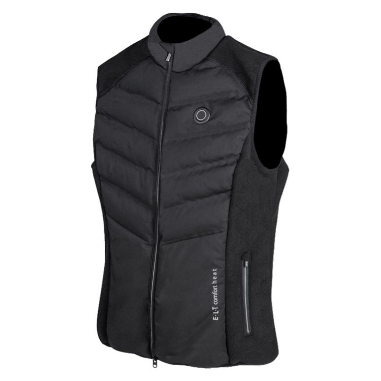 Sex värmeelement är strategiskt placerade – två framtill, ett i kragen och tre på ryggpartiet – och temperaturen kan enkelt justeras mellan 45 °C, 50 °C och 55 °C via en knapp på bröstet, där den valda nivån visas med färg. Västen har en innerficka med USB-anslutning för powerbanken, en tvåvägsdragkedja framtill med hakskydd samt två sidofickor med dragkedja. Diskreta E·L·T-loggor och silverfärgade detaljer ger ett exklusivt intryck.